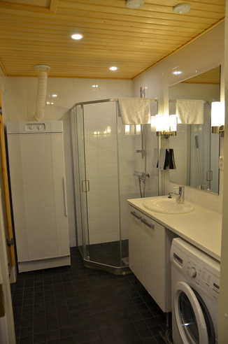 ![]() Lomasäätiön Chalets Vuokatti tyylikäs pesuhuone. Pesuhuone ja kuivauskaappikin kuuluu varusteisiin. |